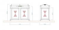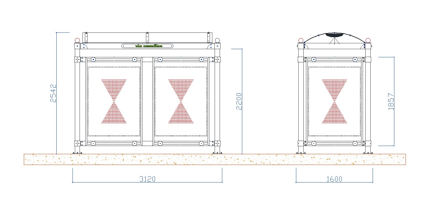Struttura in metallo, composta da copertura funzionale e decorativa, quattro montanti con sfere, barre strutturali e pannelli di chiusura a barre. Versioni a 1,2 e 3 lati.