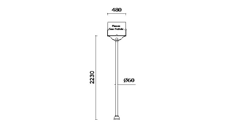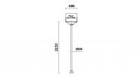 Struttura tabellone in metallo, composta da un palo con sfera decorativa per fissare un semplice supporto-contenitore al pannello informativo in pietra.