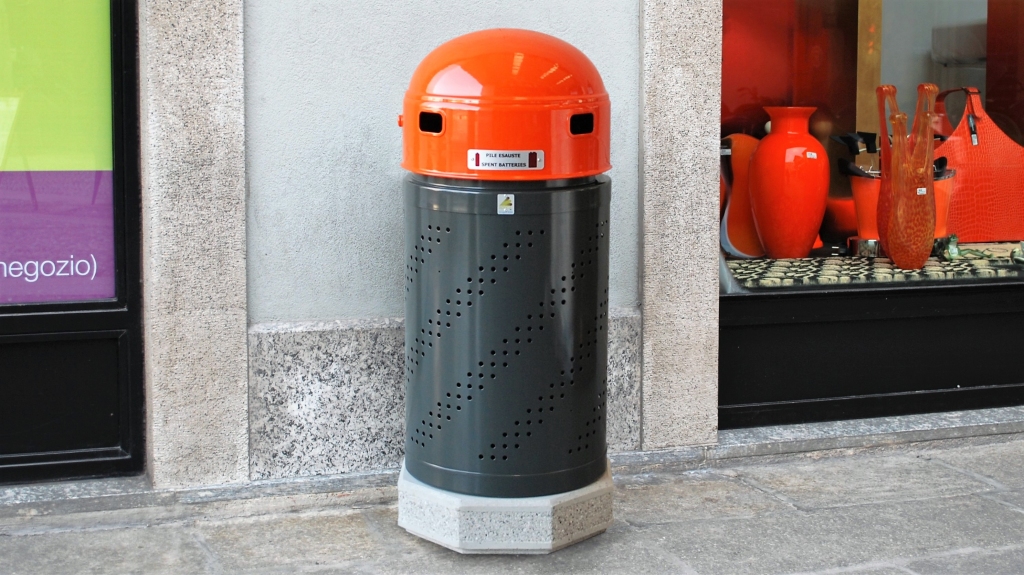 Copertura in metallo, idonee aperture per il conferimento delle pile. Internamente due cestelli in lamiera per il loro contenimento.