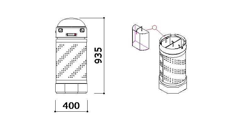 Struttura in metallo, provvista di serratura; rivestimento in lamiera forata di finitura e copertura superiore con apertura a compasso;