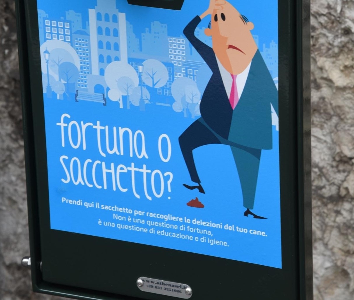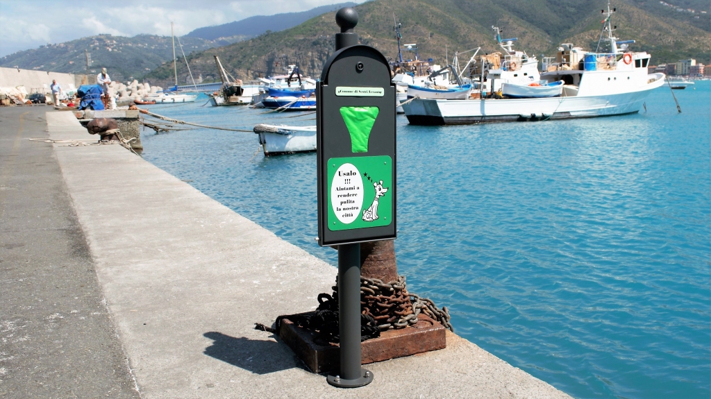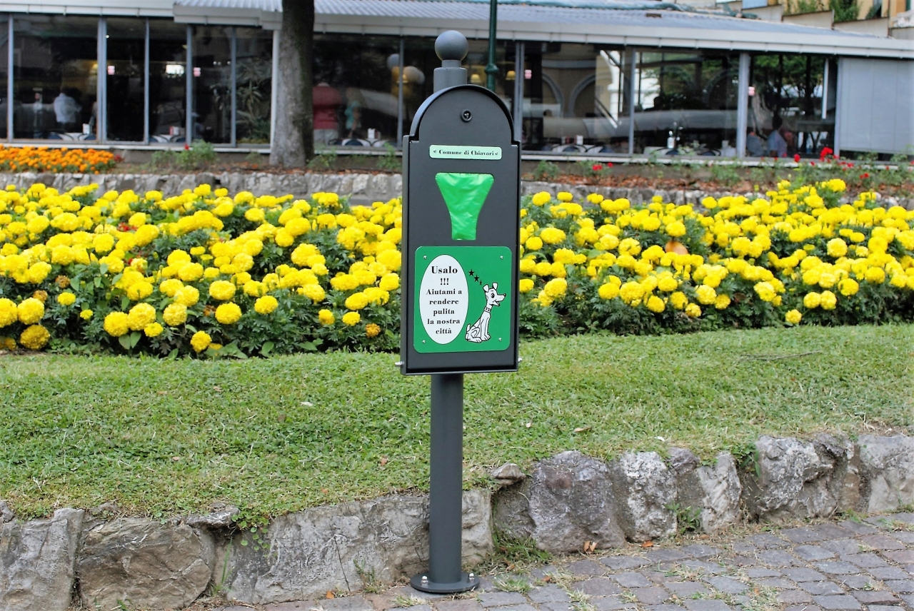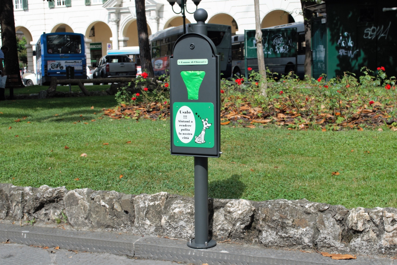 Struttura telaio dotato di staffe per il fissaggio a muro e a palo. internamente è prevista una sede per l'affrancatura e l'alimentazione dei sacchetti. lo sportello di accesso è dotato di serratura.