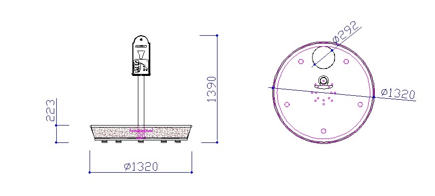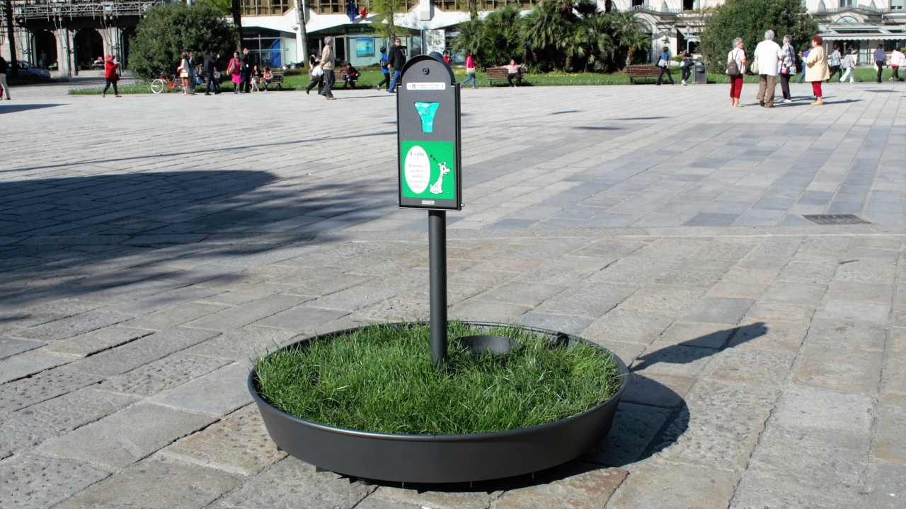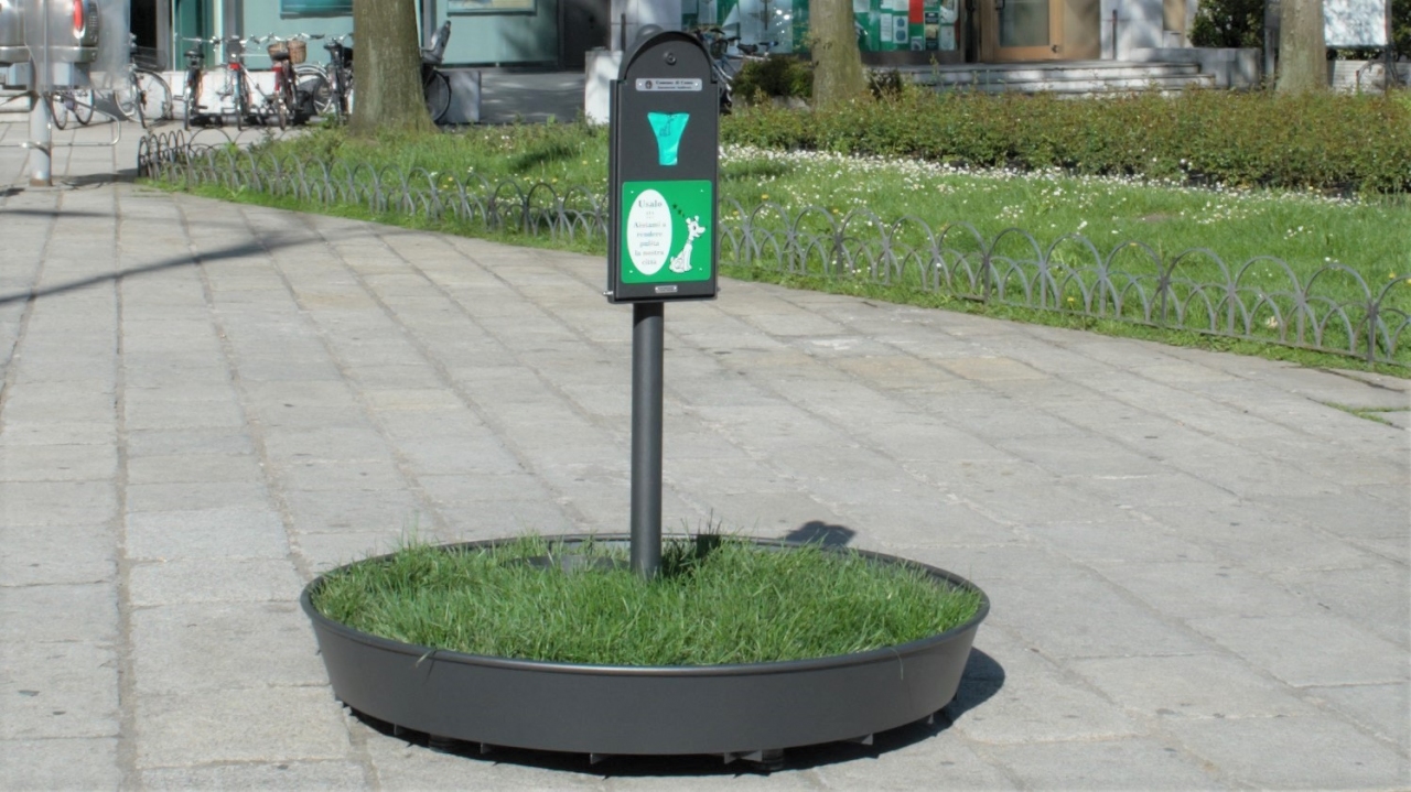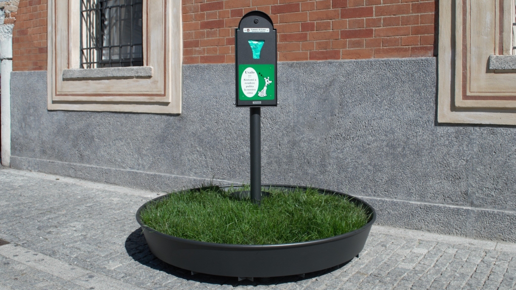 Esso è costituito da : Vasca tronco conica in acciaio inox completamente verniciata, rifinita con tubo saldato con funzione protettiva. Poggia su 5 piedini in ABS regolabili ed è irrobustita da un fondo non in vista a nido d'ape. Dentro la vasca si potrà inserire un sacco di contenimento in feltro o in juta, con manici per la sostituzione, riempito di sabbia e ghiaia o in alternativa un tappeto di erba. Palo in acciaio inox verniciato fissato alla base della vasca mediante viteria in acciaio inox. Distributore di sacchetti Argo : capacità 100 Pz. Ciotola in acciaio inox di contenimento dell'acqua quale abbeveratoio per il cane.