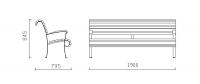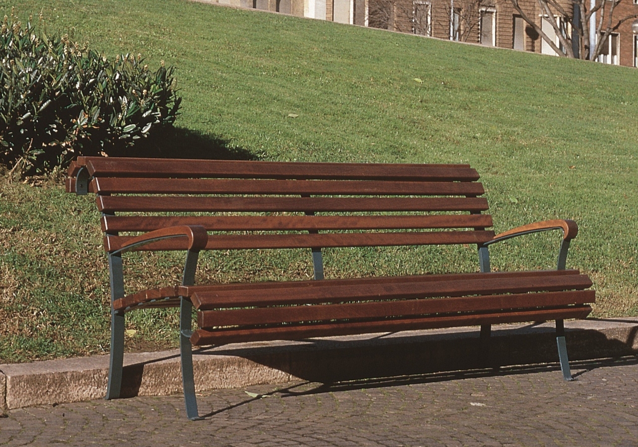 Struttura spalle ed elemento centrale di collegamento in acciaio; listoni e braccioli in legno iroko. E' previsto il fissaggio al suolo.