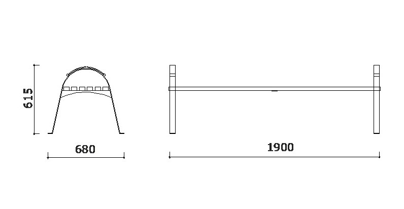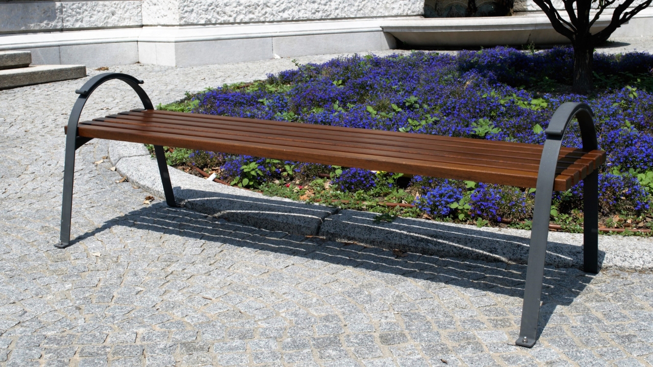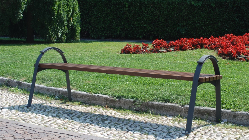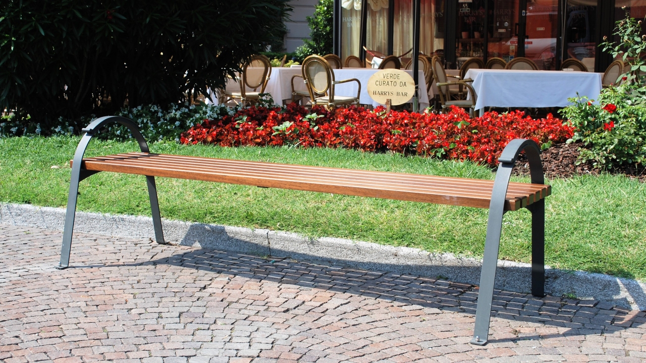 Struttura sostegni in acciaio con ricavati braccioli, listoni in legno iroko impregnato antibatterico. E' previsto il fissaggio al suolo.