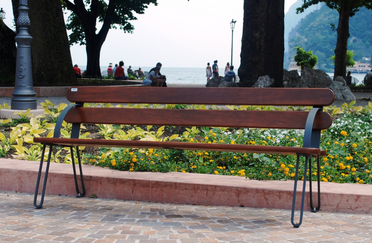 Struttura spalle con bracciolo composte da piatti e quadro di acciaio piegati e saldati tra loro. Listoni in legno iroko impregnato antibatterico.